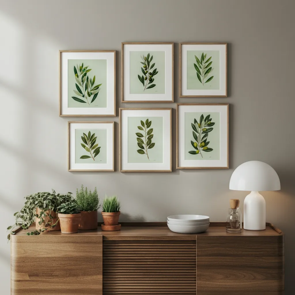 A gallery wall of framed botanical prints featuring various leaves and plants naturally incorporates shades of green, including olive.