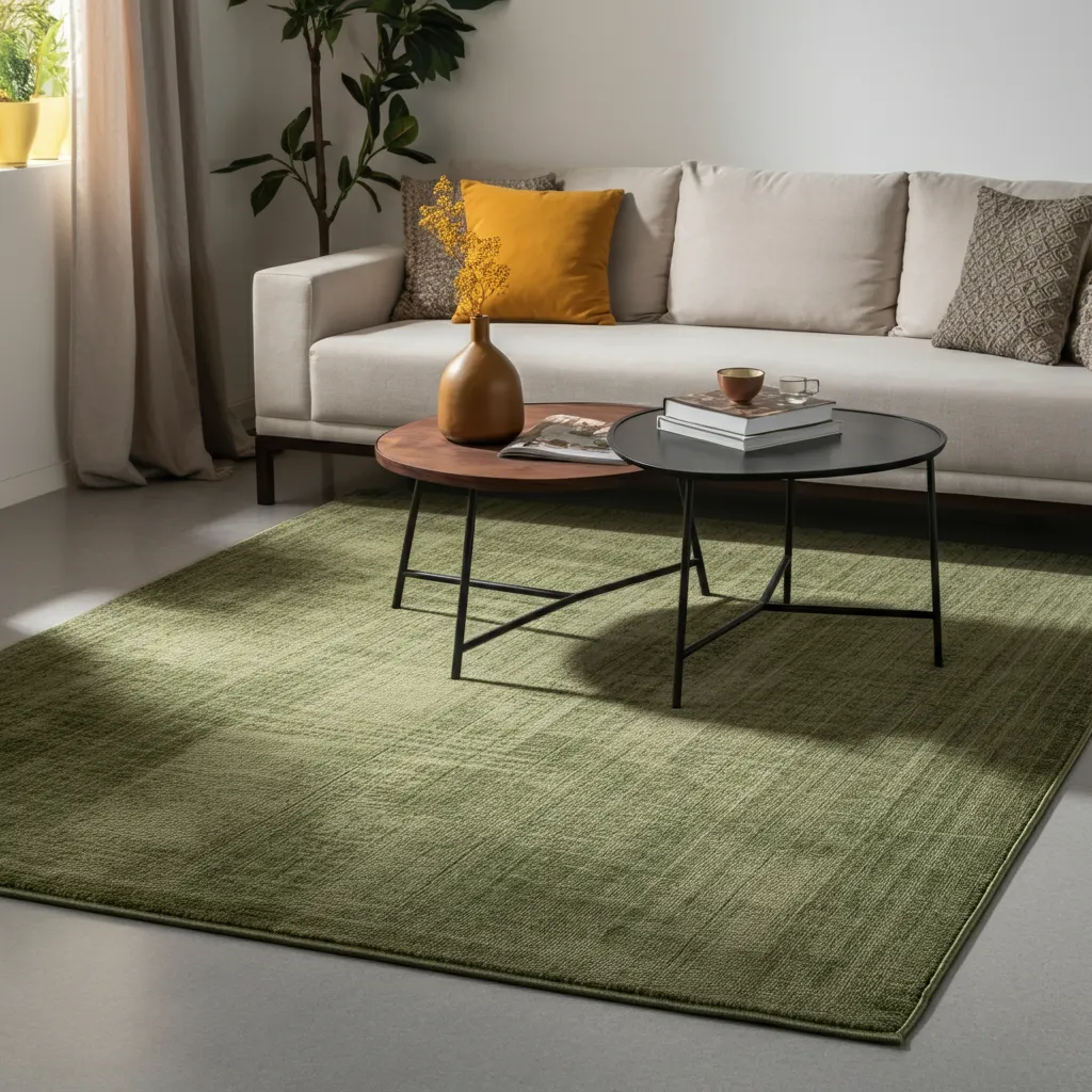 An area rug with an olive green pattern or solid color can define a space, add softness underfoot, and tie all the other green elements in the room together.