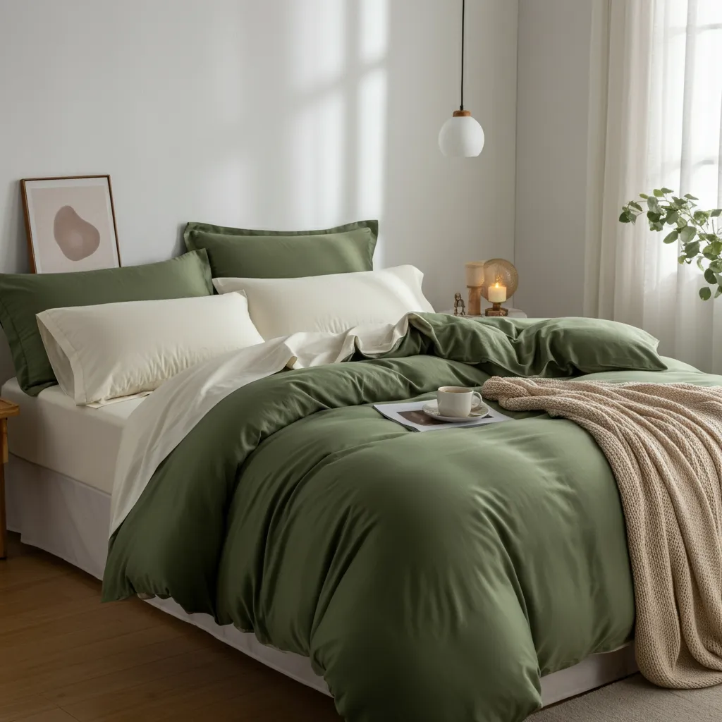 Commit to a full olive green duvet cover or comforter for a serene and nature-inspired bedroom retreat. Linen or cotton fabrics work especially well for a relaxed vibe.