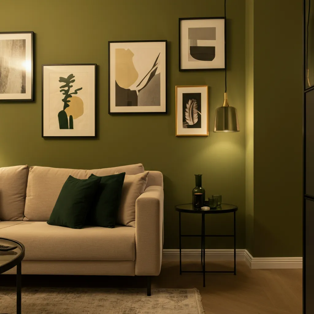 Use olive green as an accent through cushions, rugs, curtains, or wall art. Painting a single wall or using green furniture pieces can create impact without overwhelming limited space.