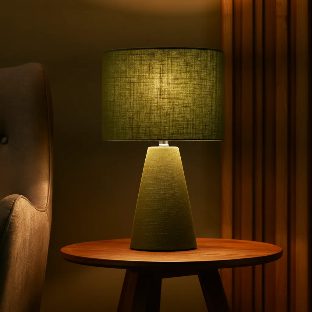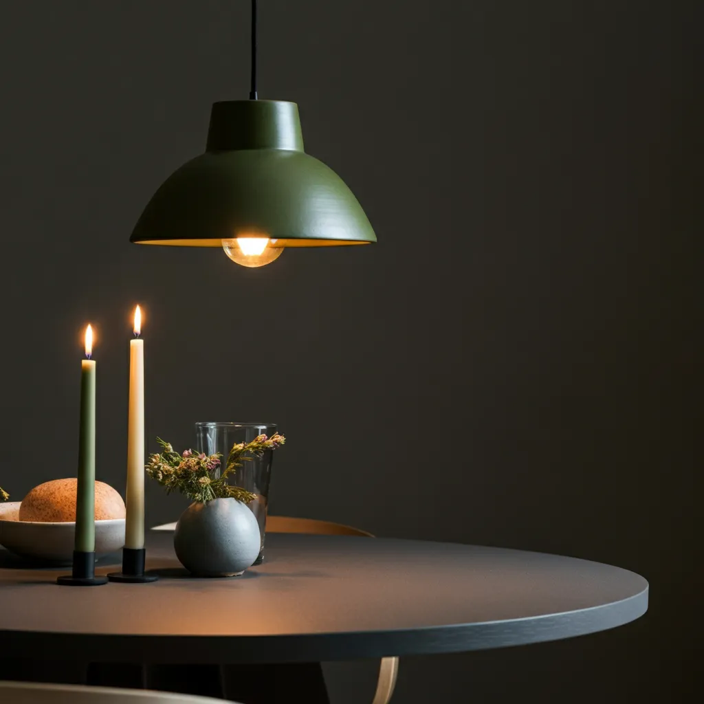 Find a pendant light or a table lamp with an olive green metal or ceramic base. It serves as both a light source and a piece of sculptural art.