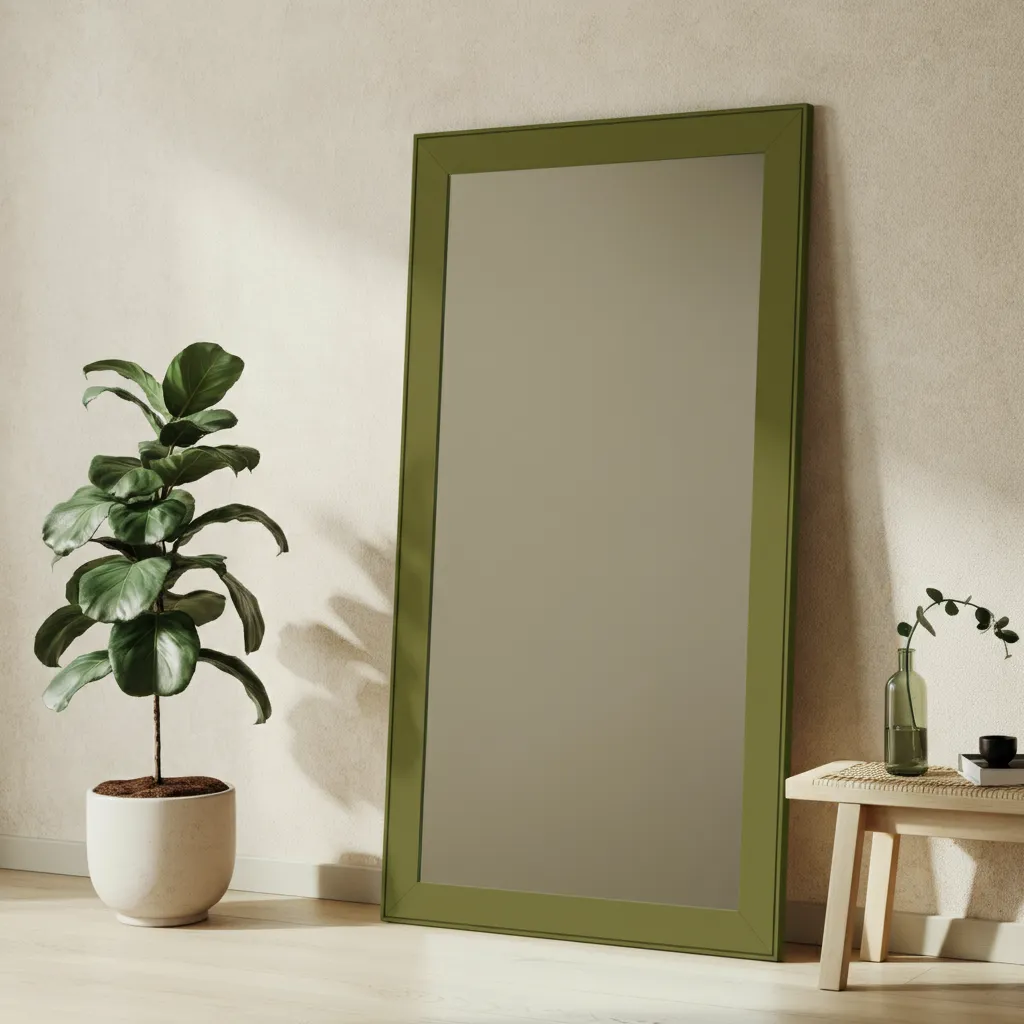 Find a large mirror with a frame painted in a matte olive green. It not only adds color but also reflects light, making your apartment feel larger.