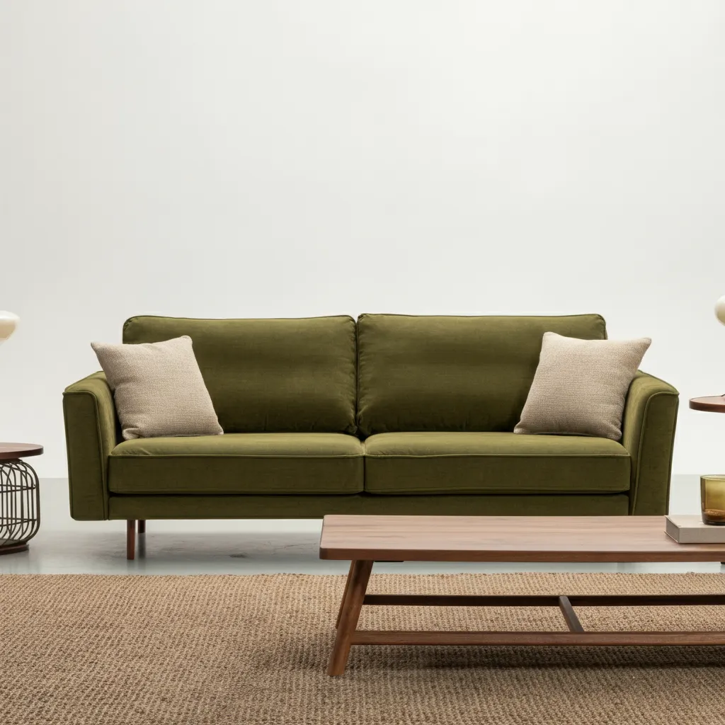 A plush, olive green velvet or linen sofa can become the stunning centerpiece of your living room. It’s a bold choice that pairs beautifully with neutral tones, warm woods, and metallic accents.