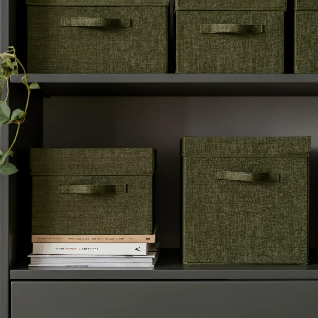 Use stylish olive green storage boxes to corral clutter on shelves or in your office. They are both functional and a lovely decor element.