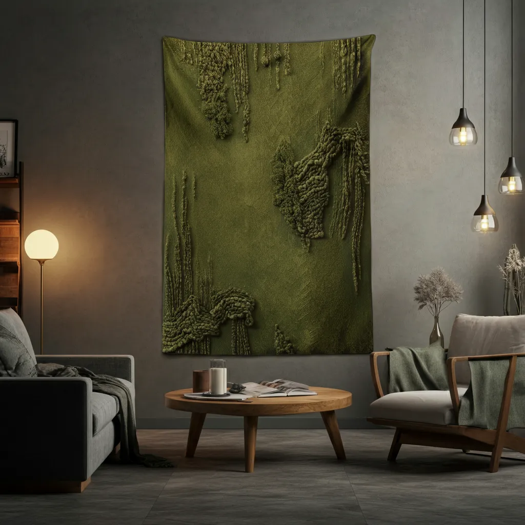 A large fabric tapestry with an abstract design or a landscape scene featuring olive tones can cover a large, empty wall and add texture and visual interest.