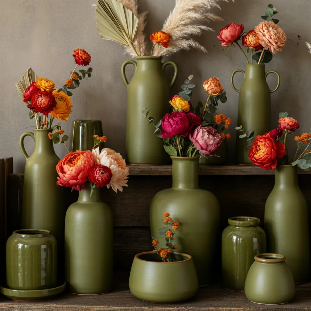 Group together a collection of ceramic vases, bowls, and pots in varying shades of olive. They look beautiful on their own or filled with fresh flowers or dried pampas grass.