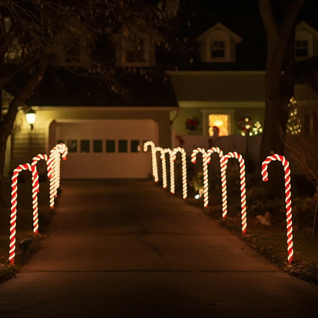 Line your driveway or walkway with candy cane-shaped poles. These are fun and whimsical, especially for families with kids.