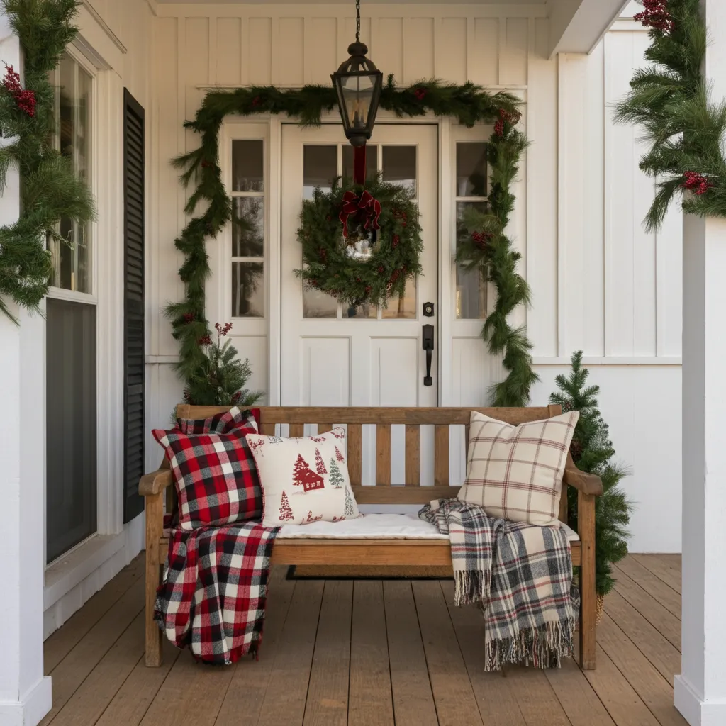 Add a bench or rocking chair with plaid blankets and festive pillows. This creates a welcoming spot for guests.