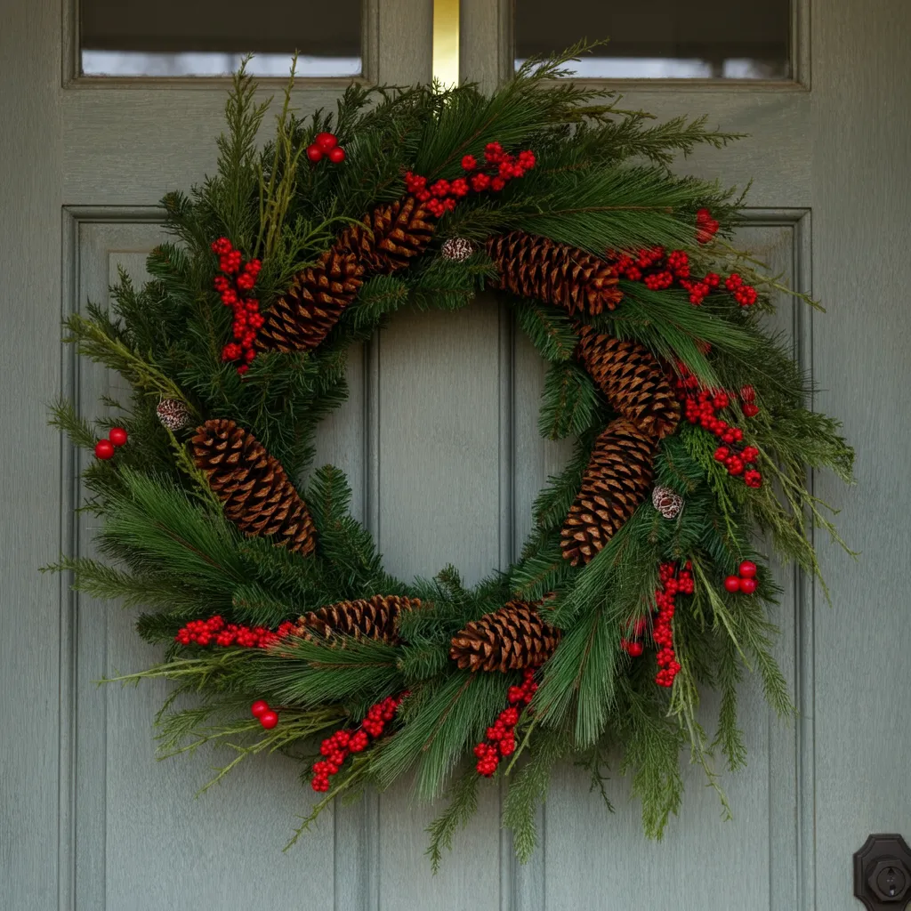 Hang a large, eye-catching wreath on your front door. Incorporate natural elements like pinecones, berries, and greenery for a rustic look.