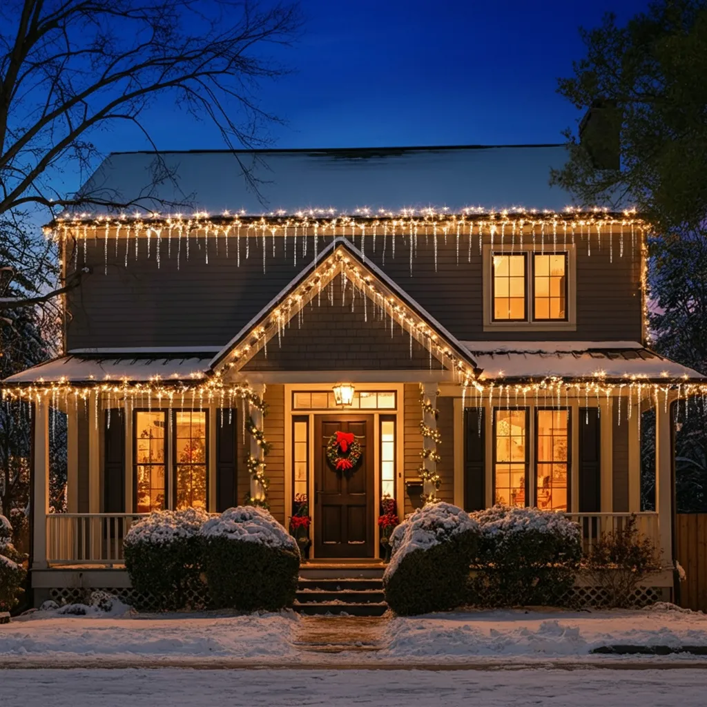 Drape icicle lights along your roofline for a classic winter look. These mimic the appearance of real icicles.