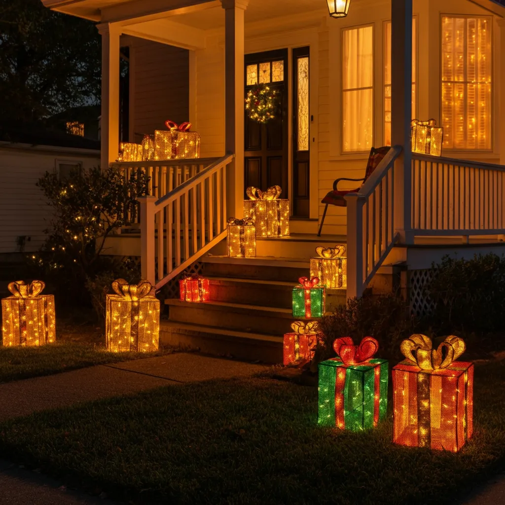 Place lighted gift box decorations on your porch or lawn. These add a playful and festive touch.