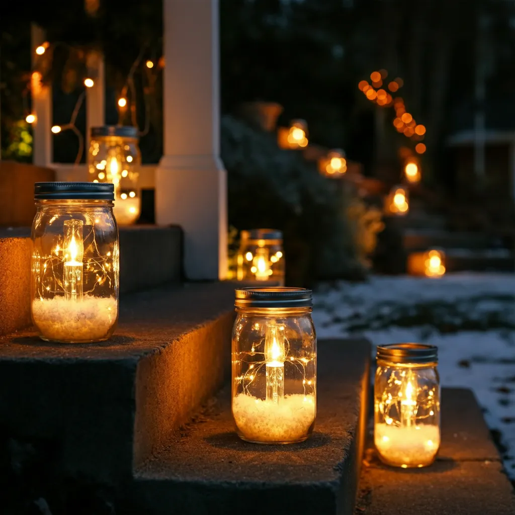 Fill mason jars with faux snow and LED candles. Arrange them on steps or along pathways for a cozy glow.