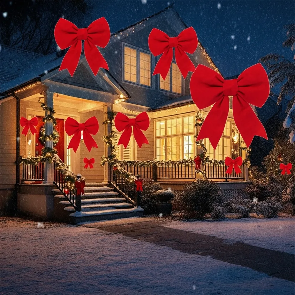 Attach oversized bows to windows, doors, or railings. Choose weatherproof materials to withstand the elements.
