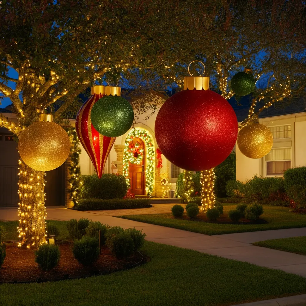 Hang oversized ornaments from trees or porch ceilings for a bold and festive statement. Choose shatterproof options for durability.