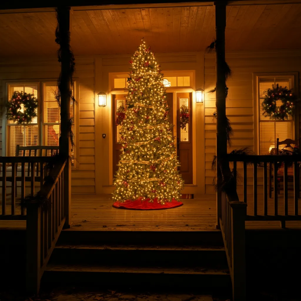 Decorate a full-sized Christmas tree on your porch with lights and ornaments. This creates a stunning focal point.