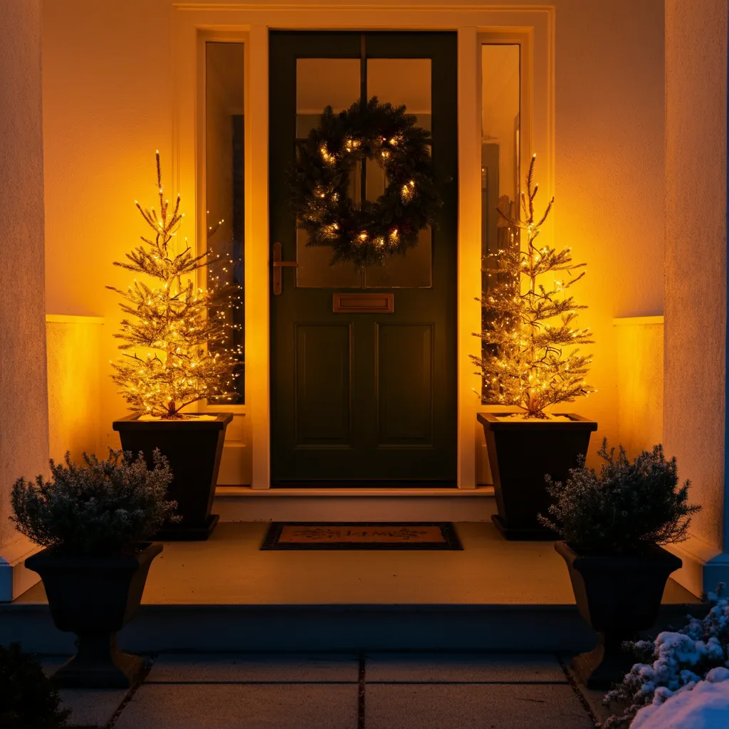 Place small, decorated Christmas trees in pots on either side of your front door. This symmetrical look is both elegant and festive.