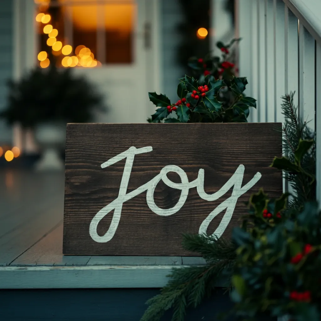 Place wooden signs with festive messages like “Joy” or “Noel” in your yard or on your porch. Distressed wood adds a farmhouse touch.