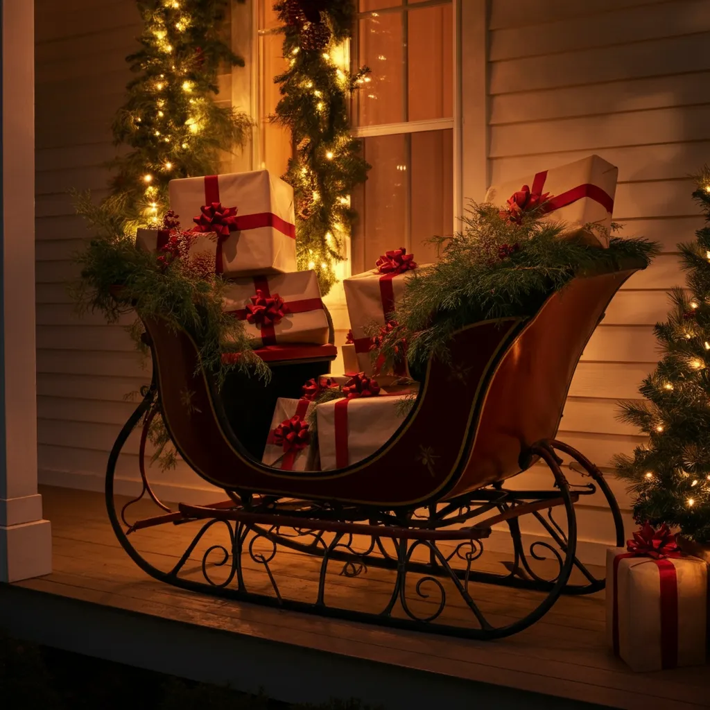 Set up a vintage sleigh filled with wrapped presents, greenery, and twinkling lights. This makes for a charming focal point.