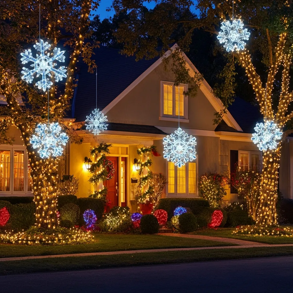 Hang large snowflake decorations on your house or trees. Choose lighted options for a sparkling effect at night.