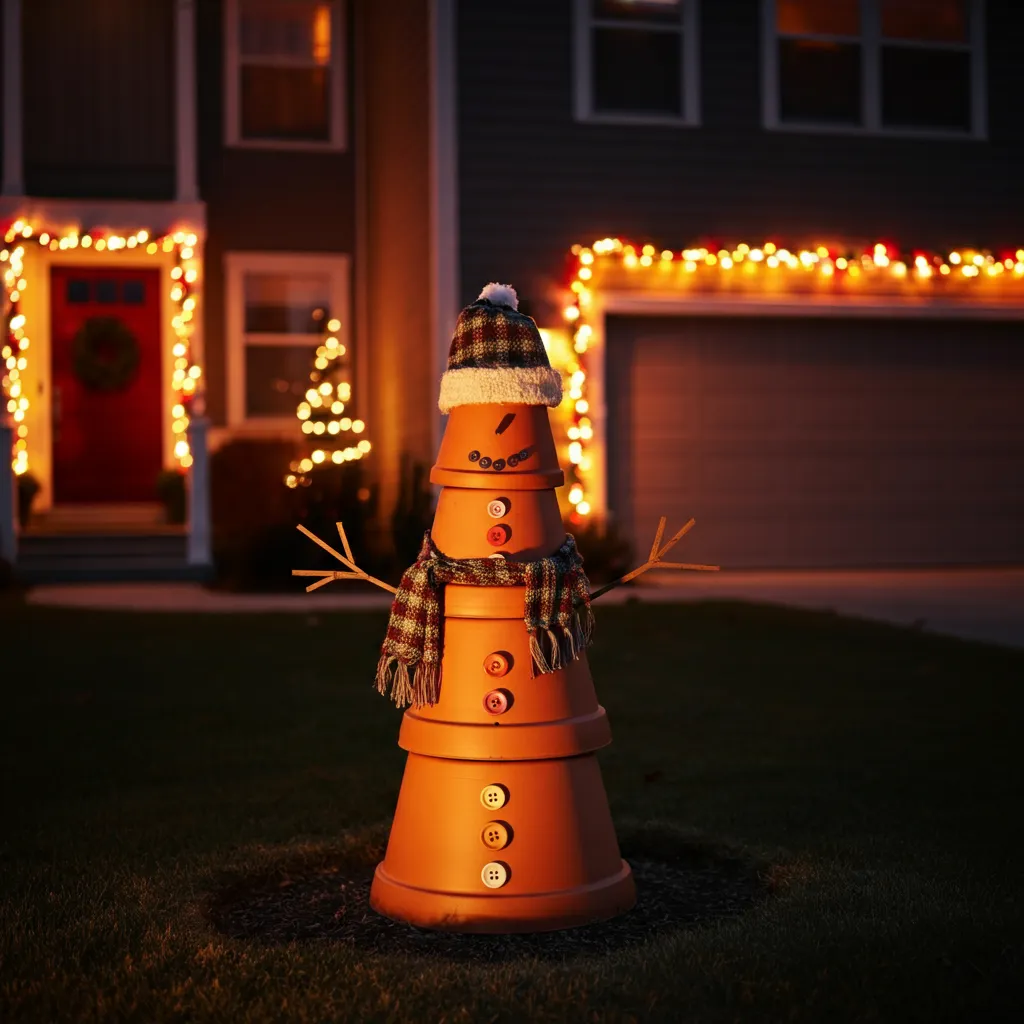 Set up a snowman figure or create one using stacked pots or lights. This is a fun and cheerful addition to your decor.