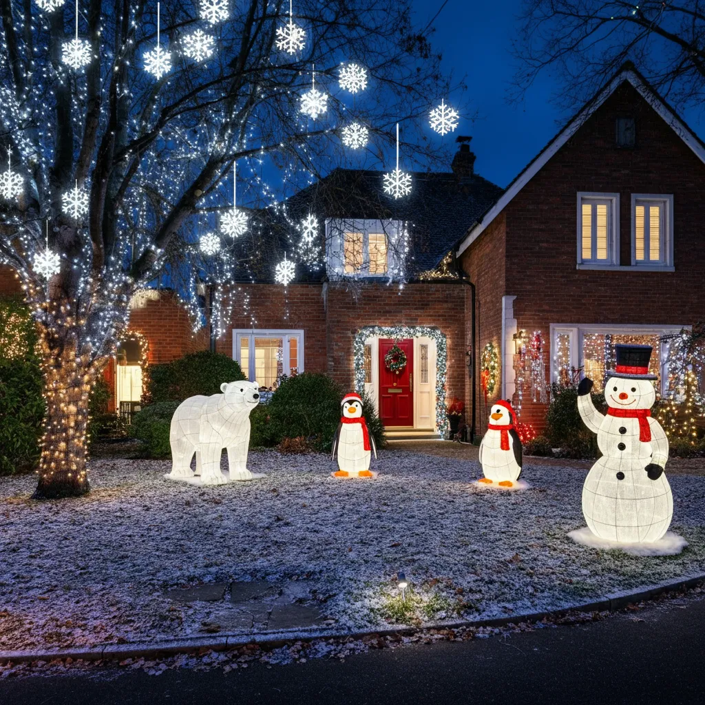Transform your yard into a magical winter wonderland by incorporating snow-themed decorations. Use lighted snowflakes, faux snow, and white LED lights to create a frosty ambiance. Add whimsical elements like glowing polar bears, penguins, or even a snowman family to bring the scene to life. This idea is festive, inclusive, and perfect for spreading holiday cheer!