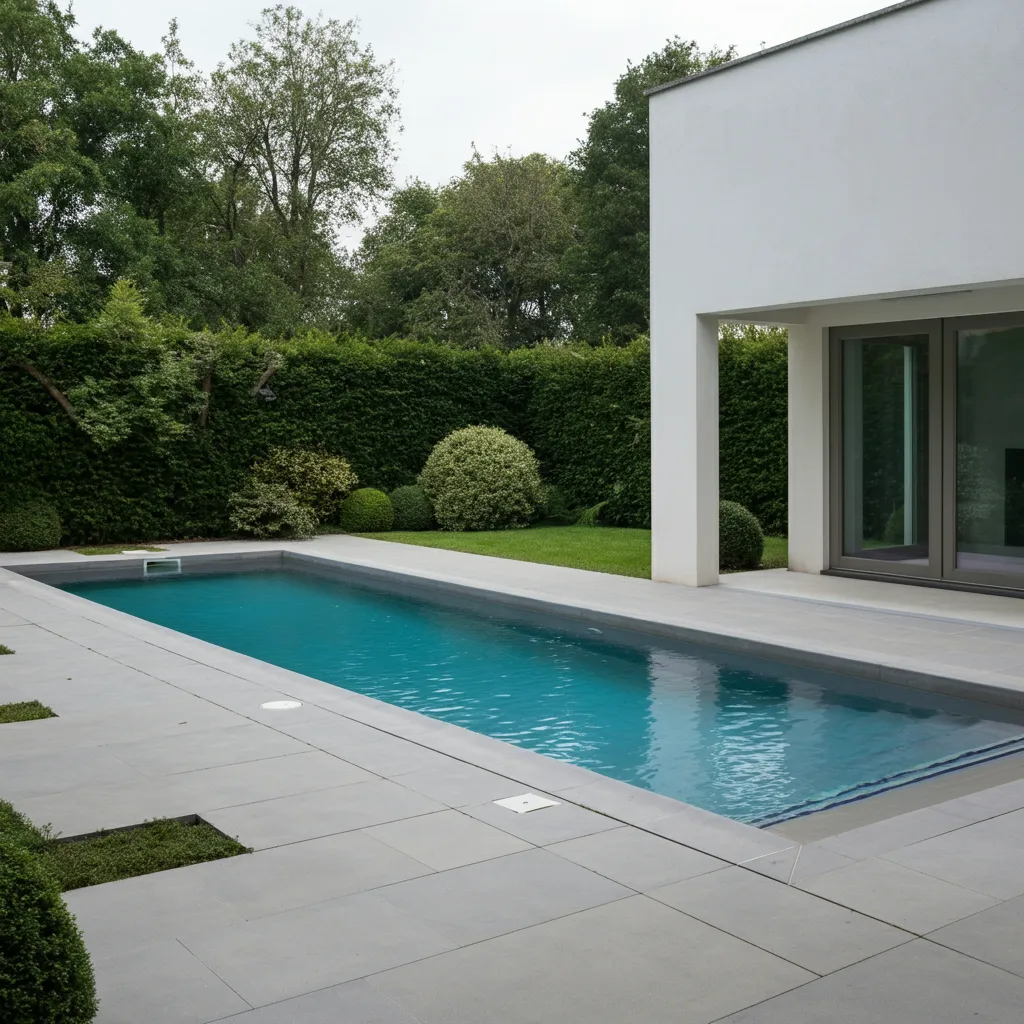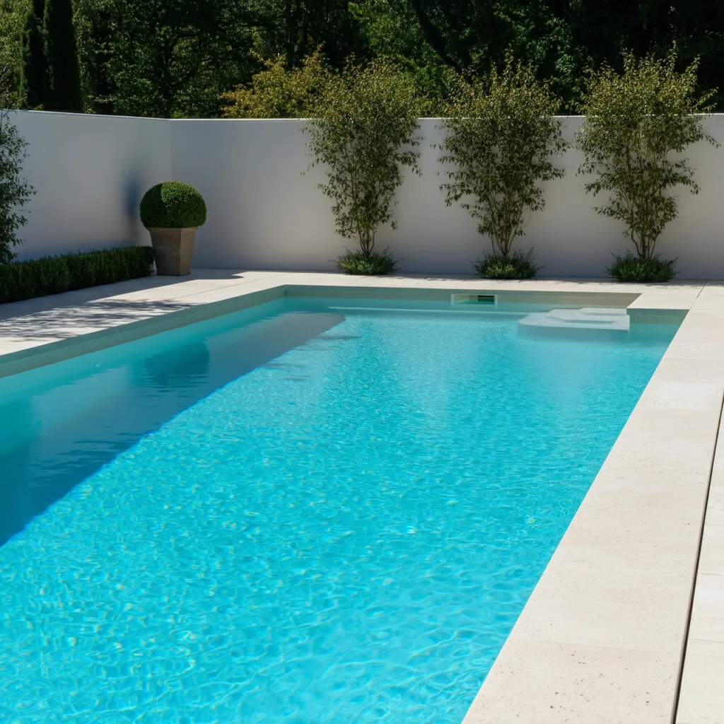 Imagine a pool basin finished in crisp white plaster or tile, surrounded by a pale travertine or limestone deck. This monochromatic scheme reflects sunlight beautifully, making the water appear exceptionally blue and inviting. It creates a bright, airy, and incredibly chic atmosphere.