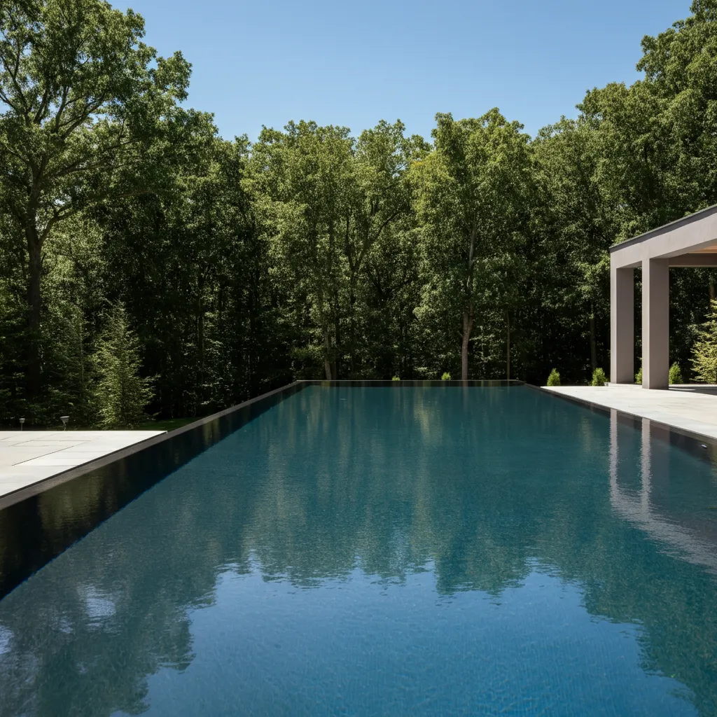 A pool with a dark-colored interior—think deep gray, black, or navy—creates a dramatic, lagoon-like effect. The dark surface absorbs heat, helping to warm the water naturally. It also reflects the surrounding trees and sky, giving it a mysterious and tranquil quality.