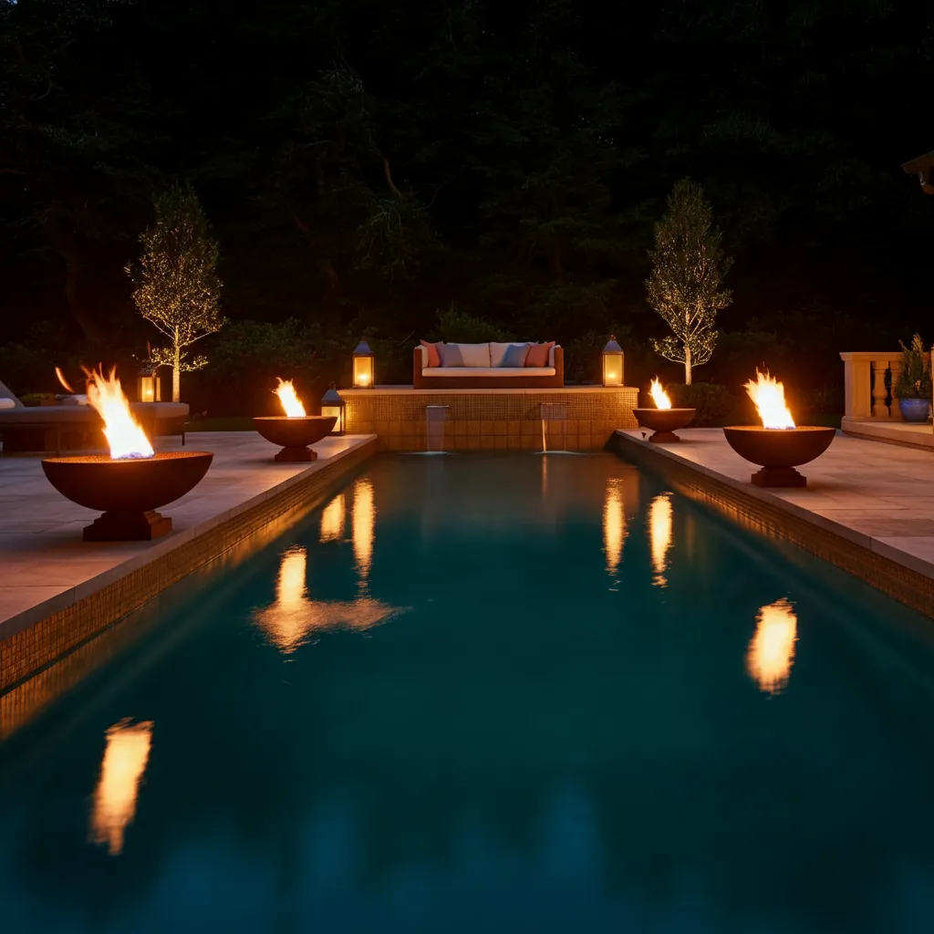 Juxtaposing fire and water creates a powerful and mesmerizing effect. A built-in fire pit or a series of fire bowls along the pool’s edge can extend your enjoyment into the cooler evenings, casting a warm, flickering glow over the water.