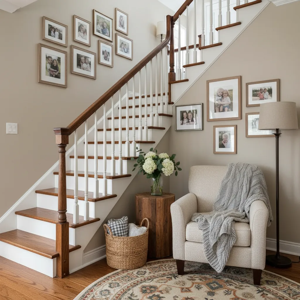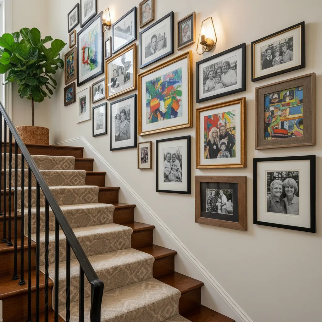 Turn your staircase wall into a personal art gallery. Display a collection of family photos, favorite prints, or unique artwork. Use frames of various sizes and styles but keep a cohesive element, like a consistent color or material, to tie them all together.