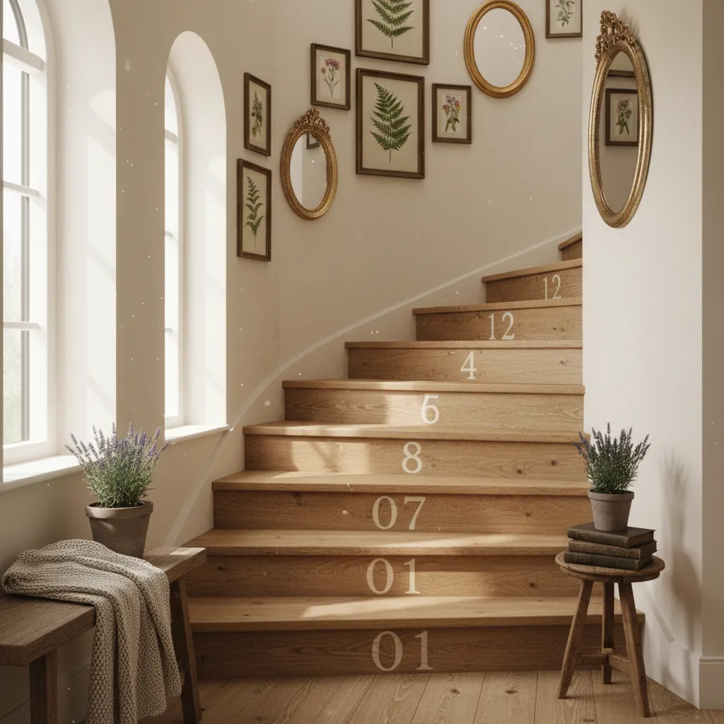 For a touch of whimsical, vintage charm, consider adding numbers to your stair risers. You can use stencils and paint for a rustic, hand-painted look or apply vinyl decals for a crisp, clean finish.