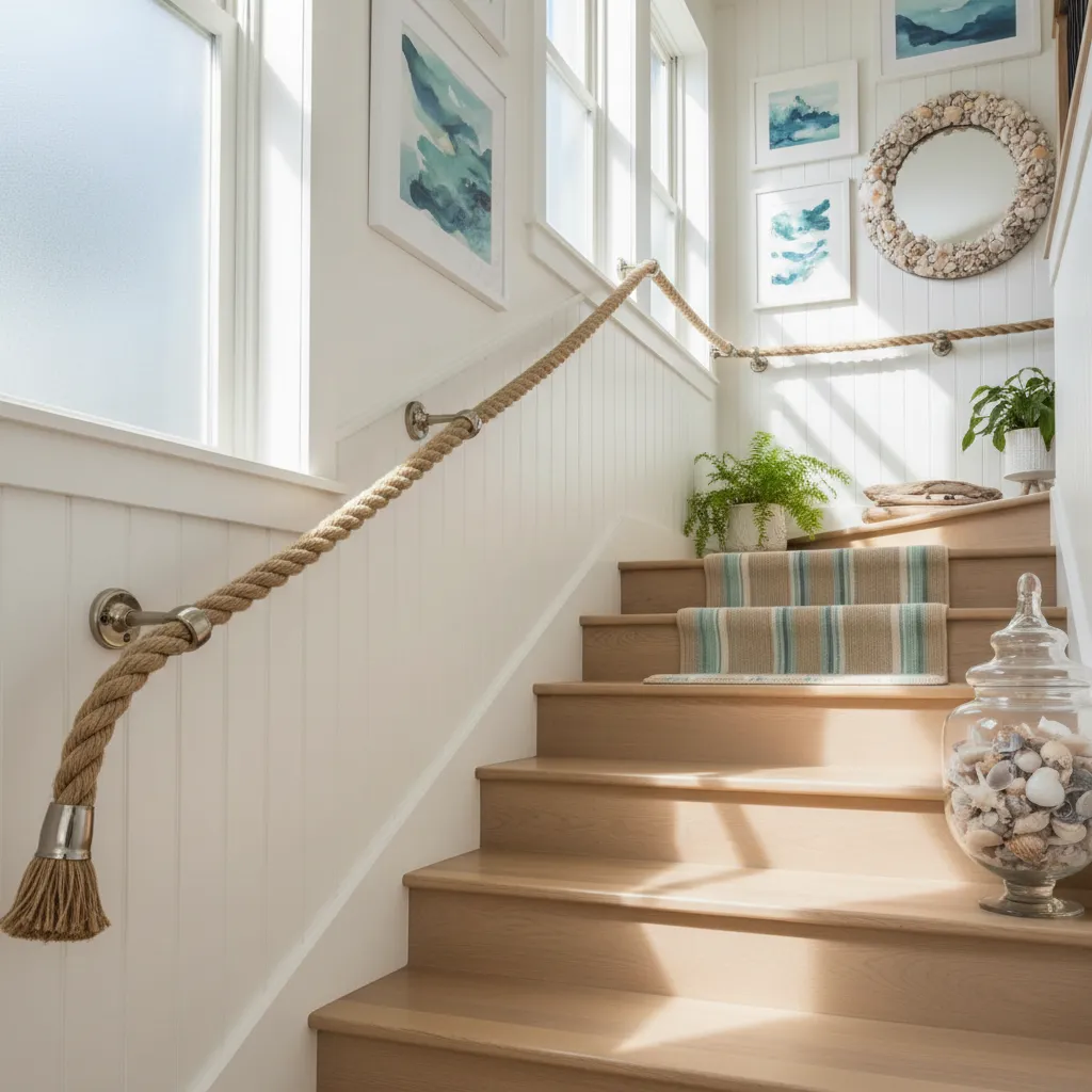 For a coastal or nautical-themed home, a thick rope handrail can be a perfect finishing touch. Secured with sturdy metal brackets, a rope handrail is both functional and highly decorative.