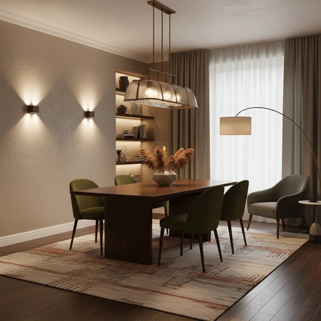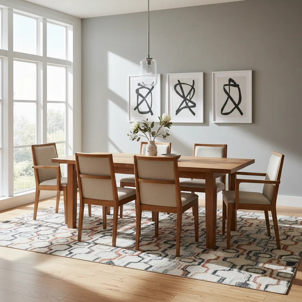 An area rug defines the dining space and adds a layer of texture and warmth. For a modern aesthetic, choose a rug with a subtle geometric pattern or a solid, neutral color. Make sure it’s large enough so that when you pull the chairs out, they still sit comfortably on the rug.