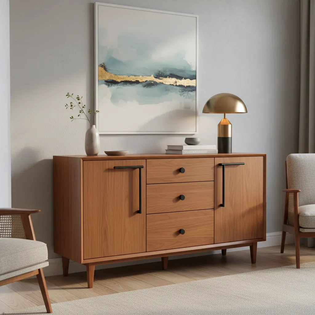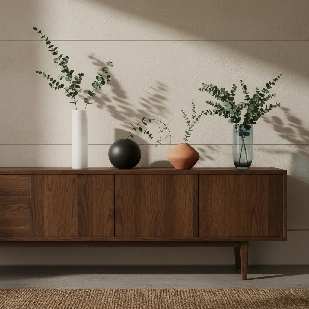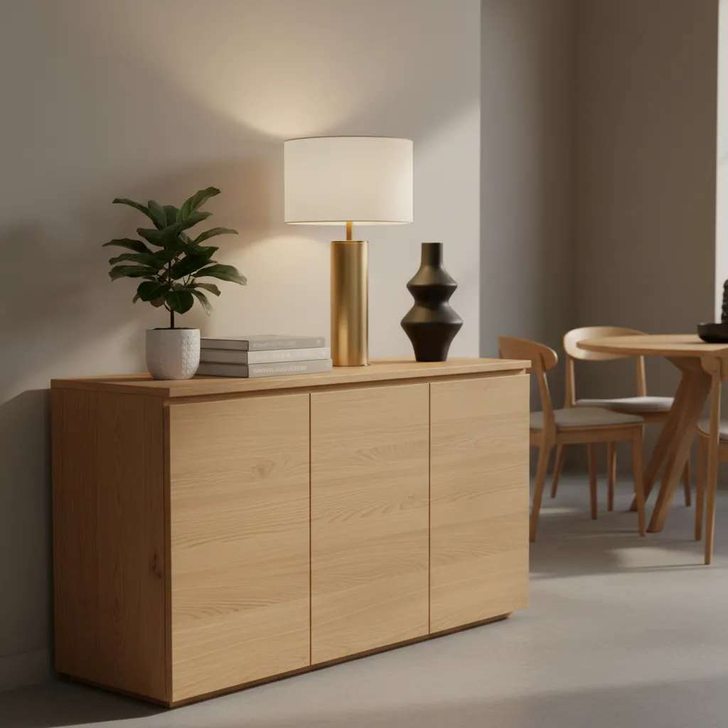 A sideboard or buffet offers both style and storage. Look for a piece with clean lines, handleless doors, and a natural wood or matte lacquer finish. This is the perfect surface for setting up a drink station, displaying art, or placing a stylish table lamp.