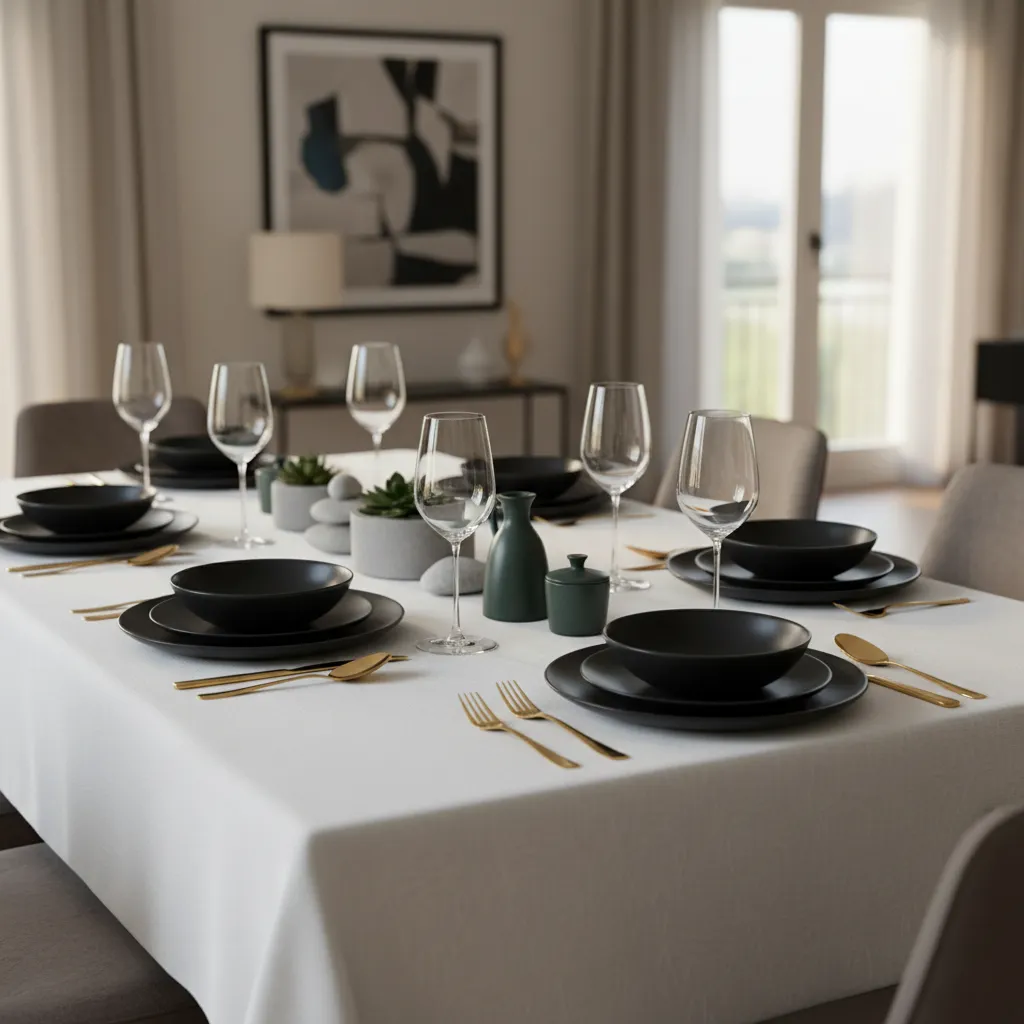 Your plates, glasses, and flatware are part of the decor. Invest in a set of simple, high-quality ceramic dishes in a neutral tone like slate gray, cream, or matte black. Pair them with minimalist flatware in gold, black, or silver.