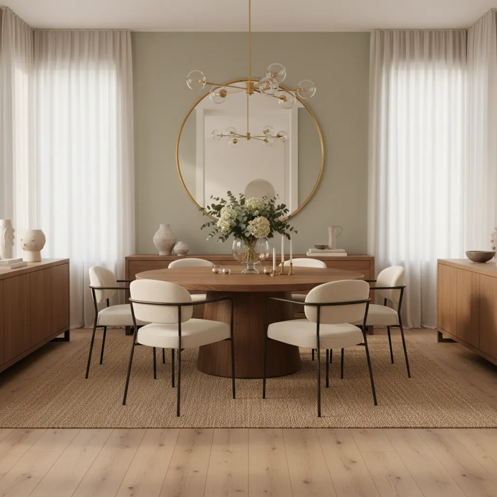 A large, round, or uniquely shaped mirror can make your dining room feel bigger and brighter by reflecting light. A mirror with a simple, thin frame in black, brass, or wood works beautifully in a modern setting.