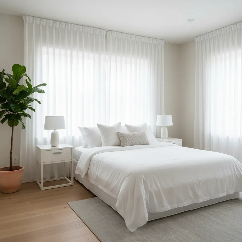 Replace blackout drapes with sheer or light-filtering curtains. They provide privacy while allowing soft, diffused sunlight to fill the space, creating a warm and inviting glow. White or off-white sheers are a classic choice that works with any decor style.