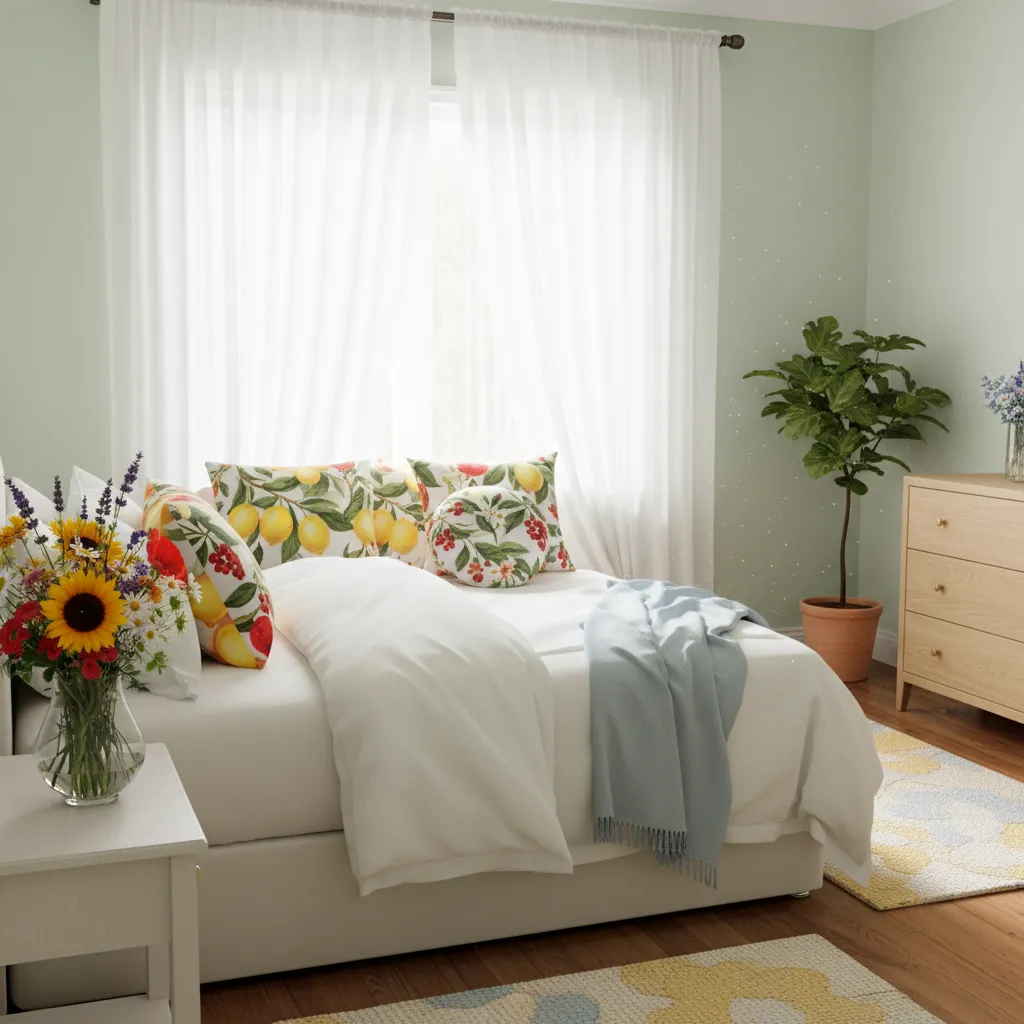 Nothing says summer like fresh fruit and flowers. Incorporate these motifs in subtle ways. A vase of fresh flowers on your nightstand is a simple classic. For a more permanent touch, consider artwork, textiles, or decorative objects featuring lemons, oranges, or your favorite blooms.
