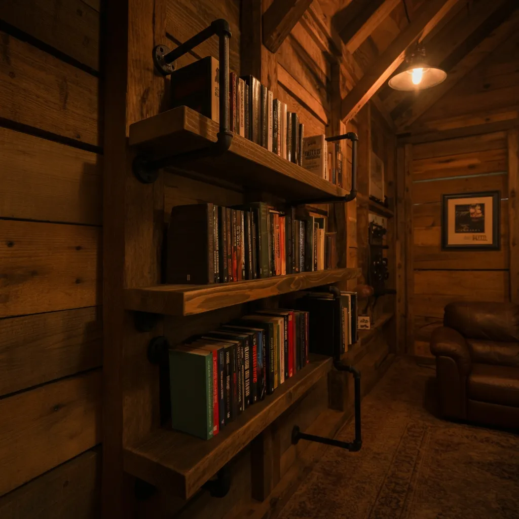 Build your own shelves using black iron piping and stained wood planks. This is a sturdy, practical storage solution that fits perfectly with the pole barn aesthetic. It’s ideal for displaying collectibles, books, or even spare parts for your projects.