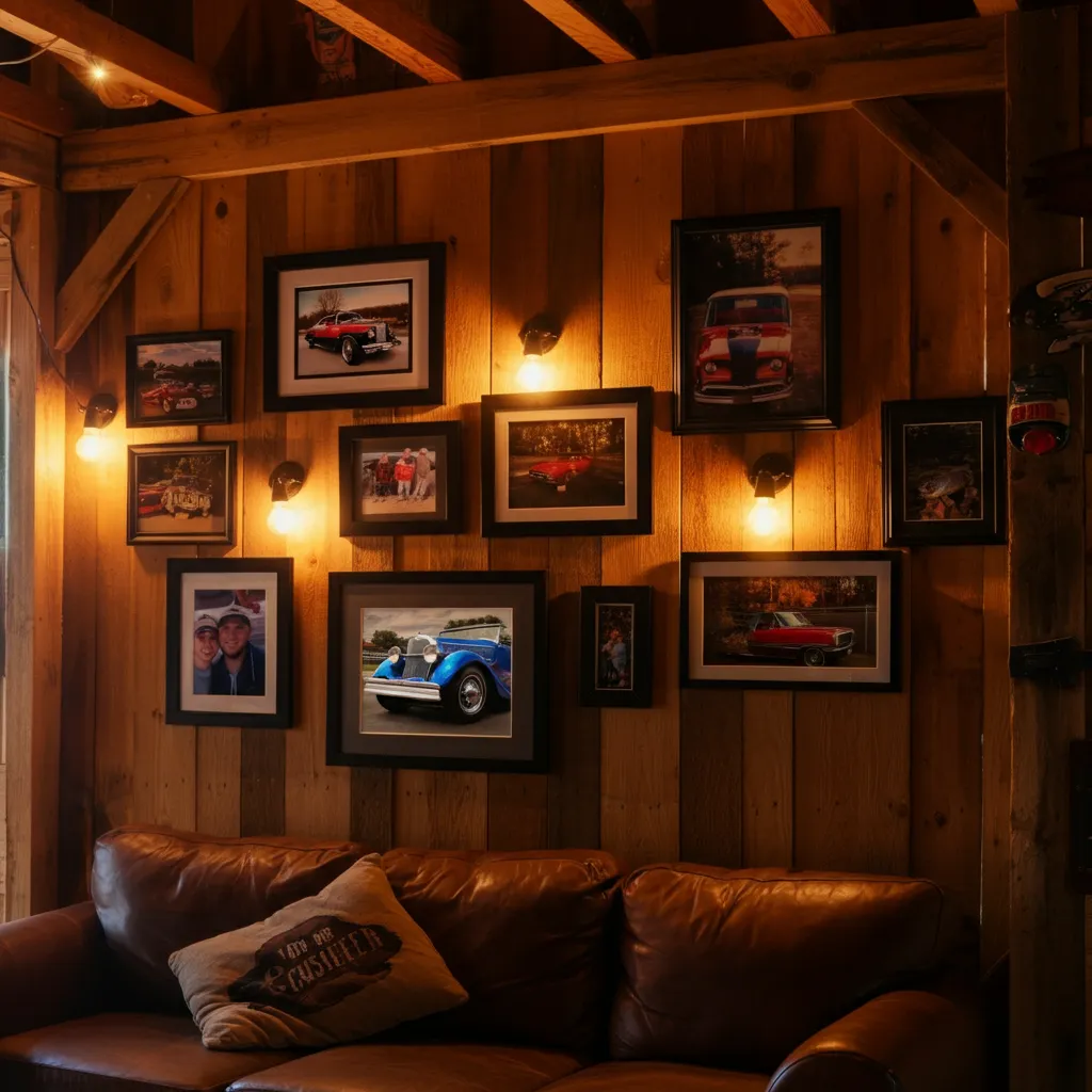 Dedicate one wall to your passions. Frame photos of your car projects, fishing trips, or family moments. Use matching frames for a cohesive look. This makes the space feel less like a commercial building and more like an extension of your home.