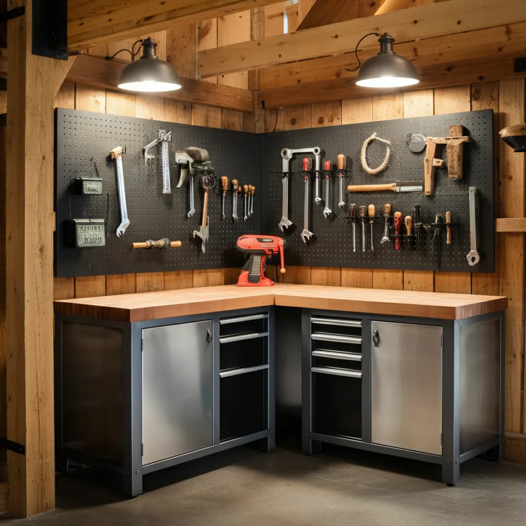If you love to tinker, integrate a workbench into the design. But keep it stylish. Use butcher block countertops and sleek metal cabinetry. Install a pegboard painted in a matte black or deep navy to organize tools neatly. This blends functionality with industrial home decor aesthetics.