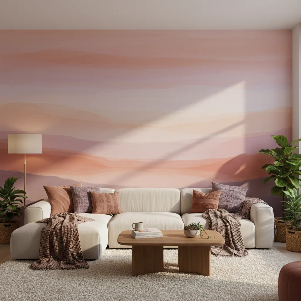 Use a sponge or a large brush to blend bands of pink, purple, and orange. Unlike the sharp lines of the retro sunburst, this is about soft gradients. It captures that golden hour glow, keeping your room feeling warm even on gloomy days.