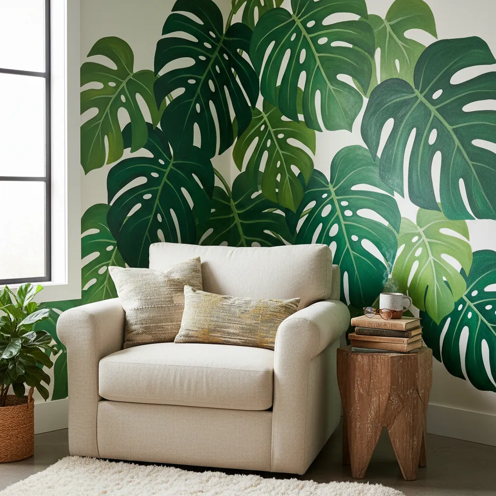 Instead of a full wall, focus on a corner. Paint vines or large monstera leaves wrapping around the corner of a room. This blurs the hard lines of the architecture and makes the space feel more organic and enveloping.