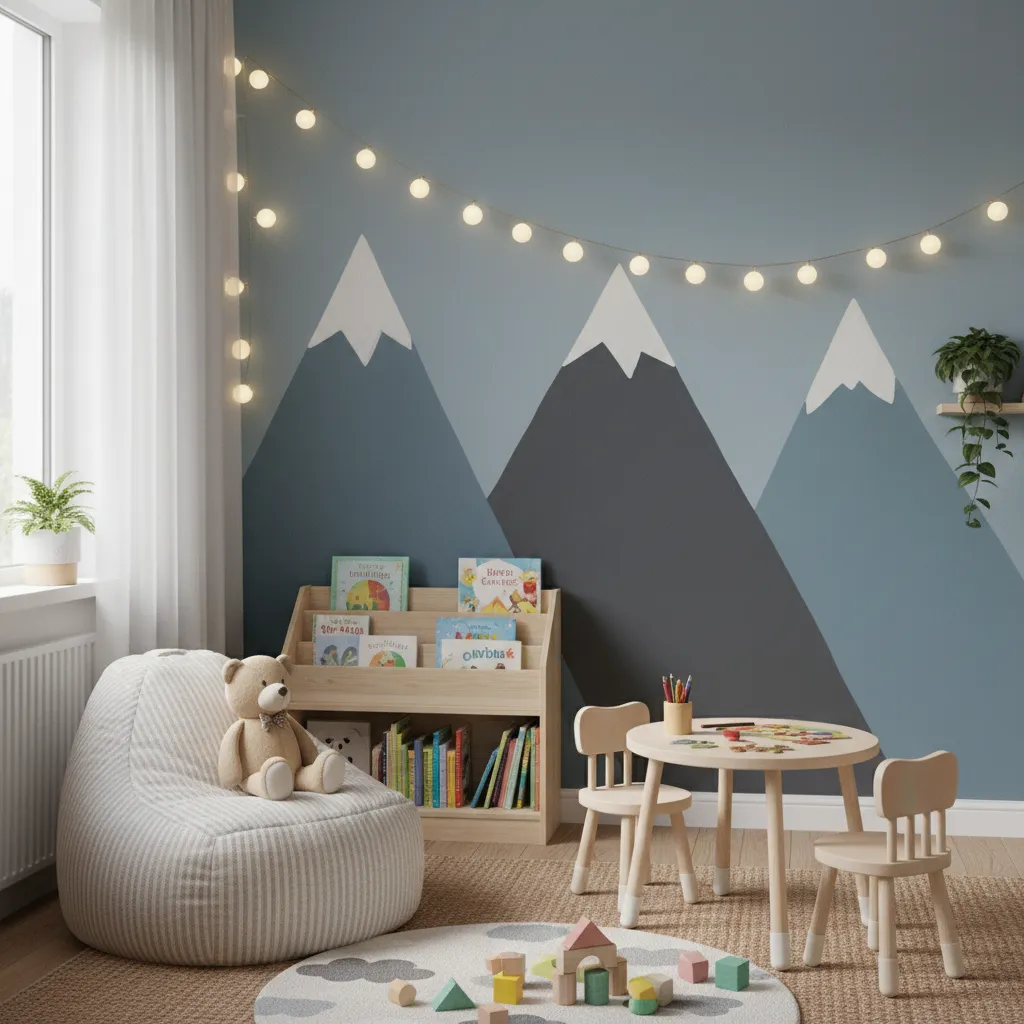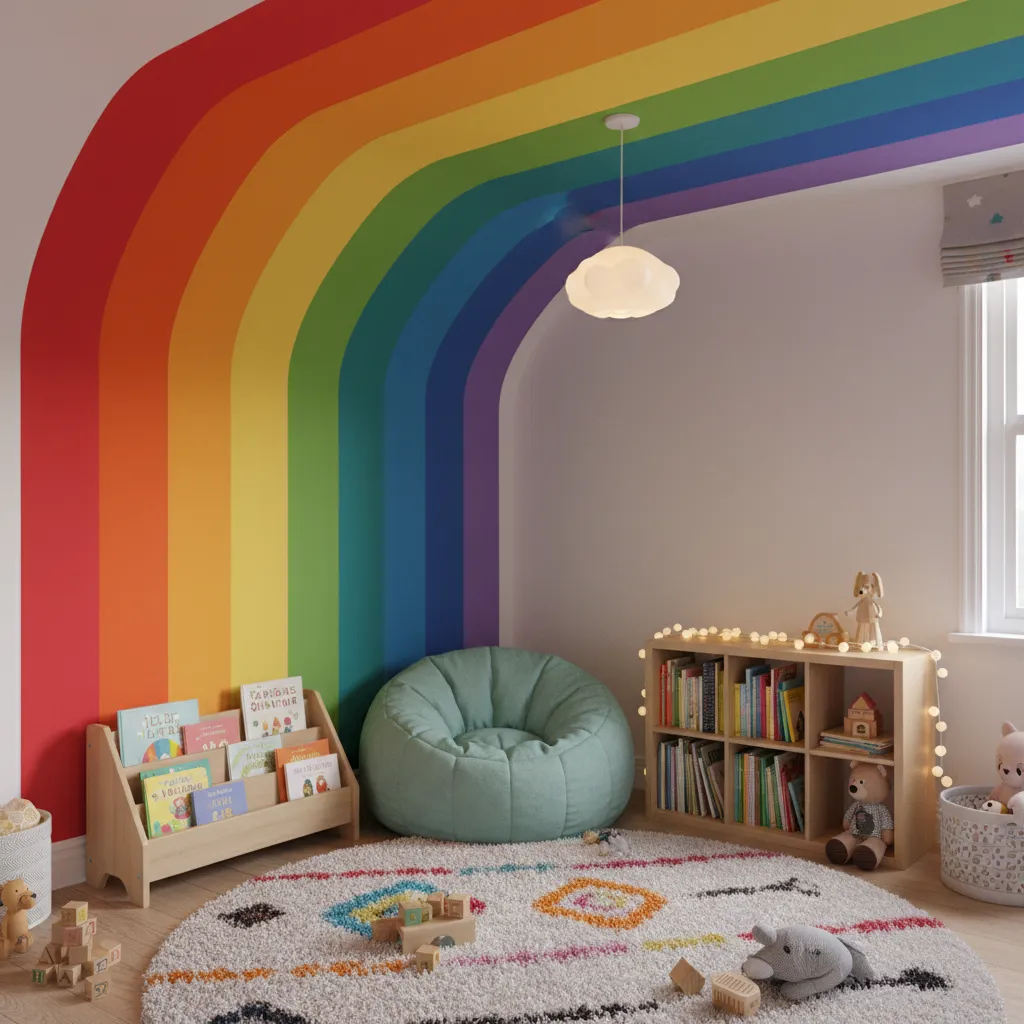 Paint a rainbow that starts on one wall and continues onto the ceiling or the adjacent wall. It creates an immersive, hugging effect that feels incredibly safe and cozy for a child.