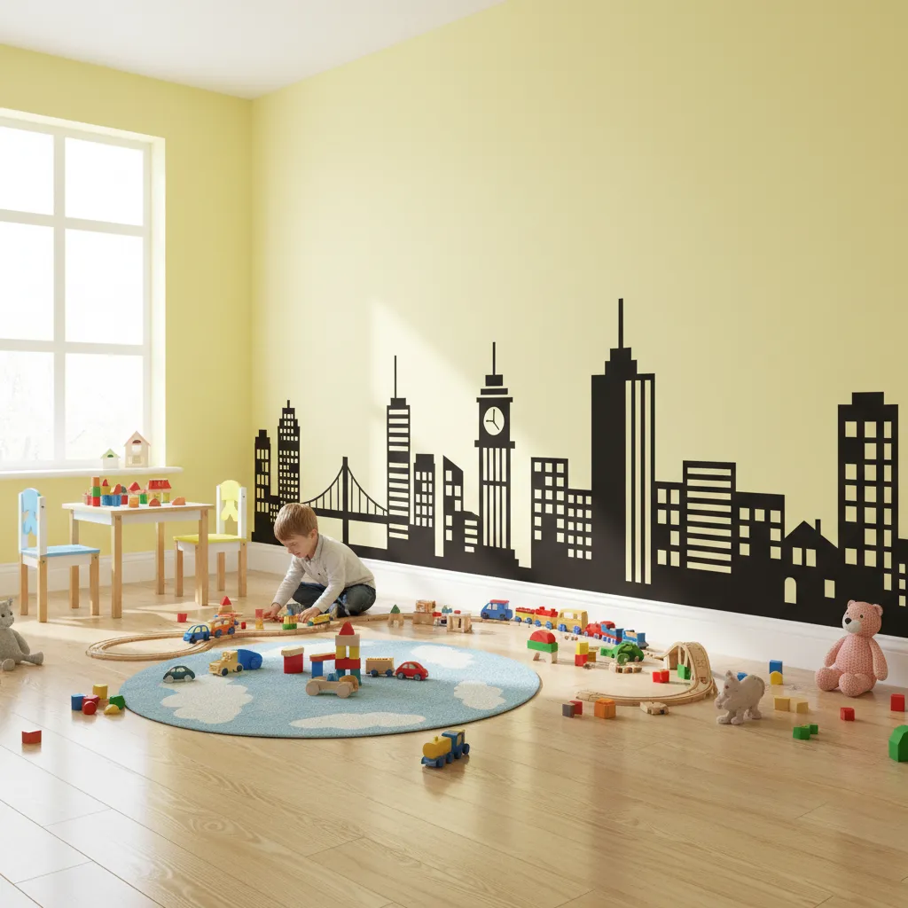 Outline a simple silhouette of buildings at the bottom third of the wall. It’s a great way to ground the room and can serve as a backdrop for toy cars and trains.