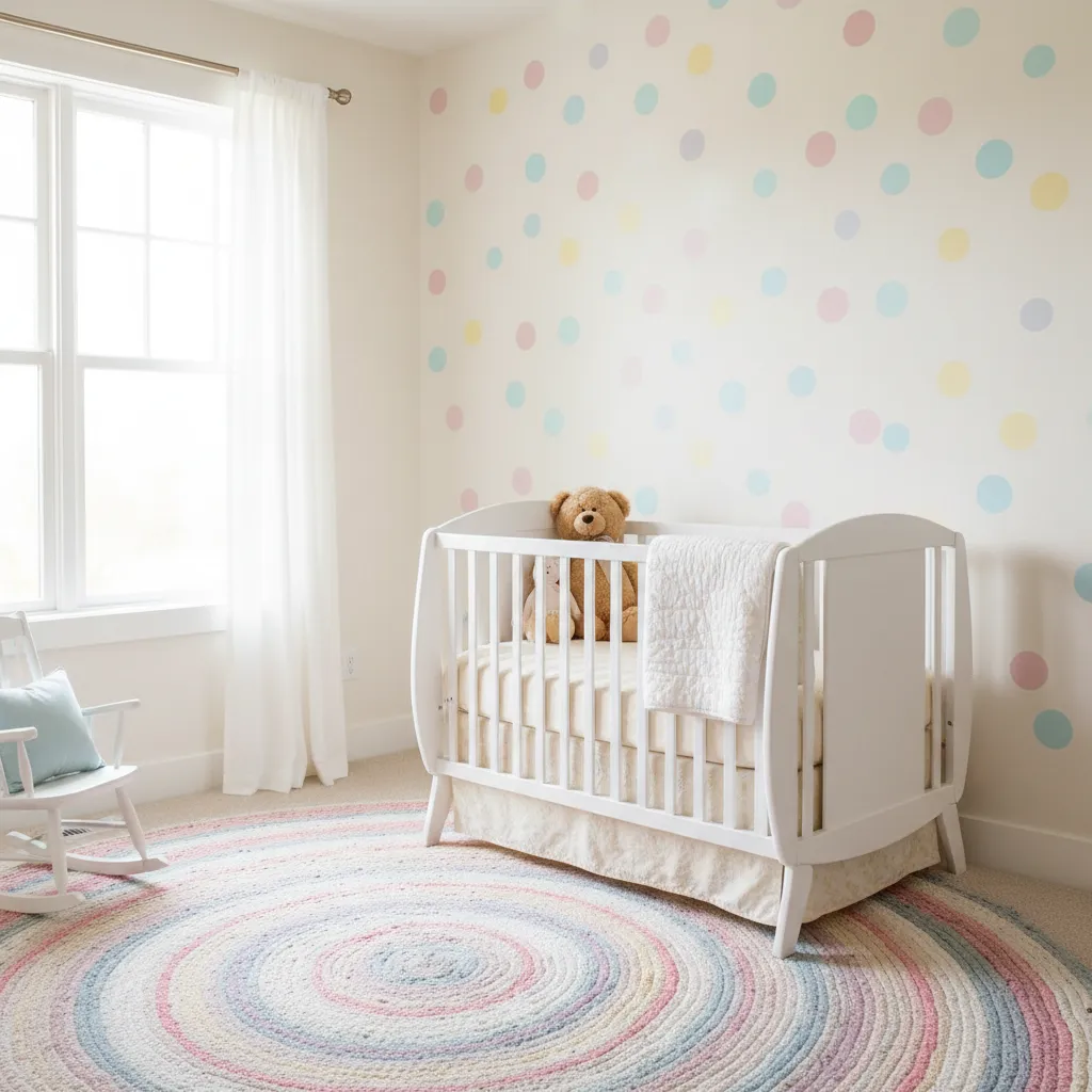 Instead of perfect circles, paint imperfect “confetti” dots all over the wall. Use a palette of 5-6 colors. It’s festive, easy, and looks great behind a crib or play area. If you are looking for more inspiration for little ones, check out these Dreamy Girls’ Nursery Decor Ideas.