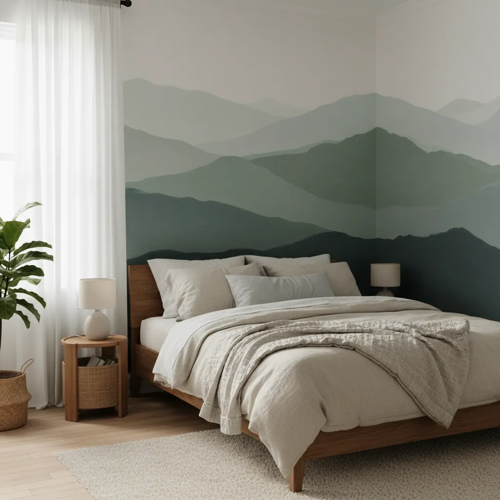 This is easier than it looks. Paint overlapping waves of color horizontally across the wall. Start with dark green at the bottom, transitioning to lighter greens and blues as you move up. It creates a serene, misty mountain effect perfect for a bedroom.