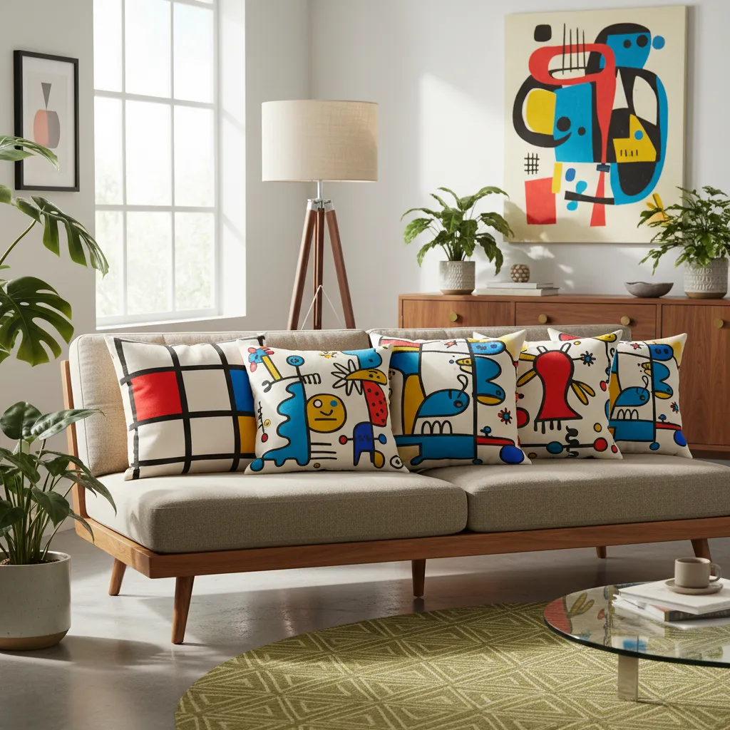 You don’t need to paint a wall to have art in your room. Use your sofa as a gallery. Throw pillows featuring abstract shapes and primary colors—reminiscent of Piet Mondrian or Joan Miró—can transform a plain grey couch into a design statement. Mixing and matching sizes adds to the casual, lived-in vibe.