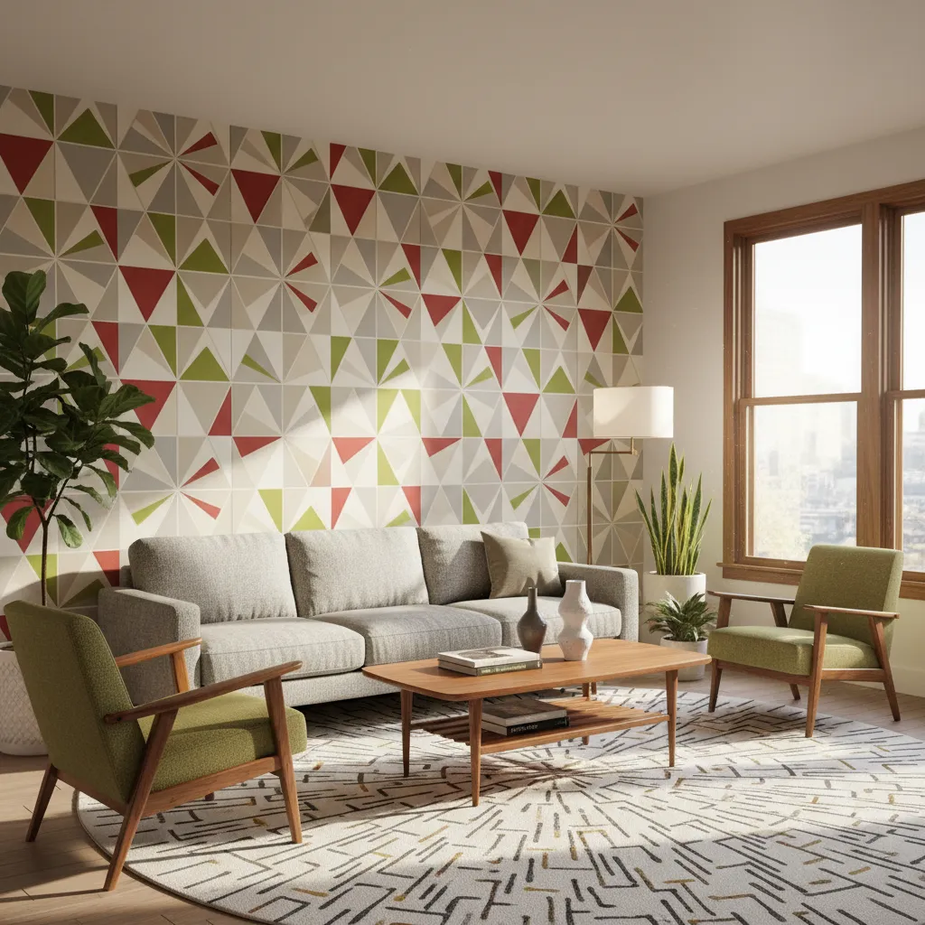 The 1950s and 60s were famous for their geometric patterns. A wallpaper feature wall with atomic age shapes or bold, repeating triangles can serve as artwork in itself. Look for wallpapers that mix neutral tones with one or two vibrant accent colors, like chartreuse or cherry red, to keep the look cohesive rather than chaotic.