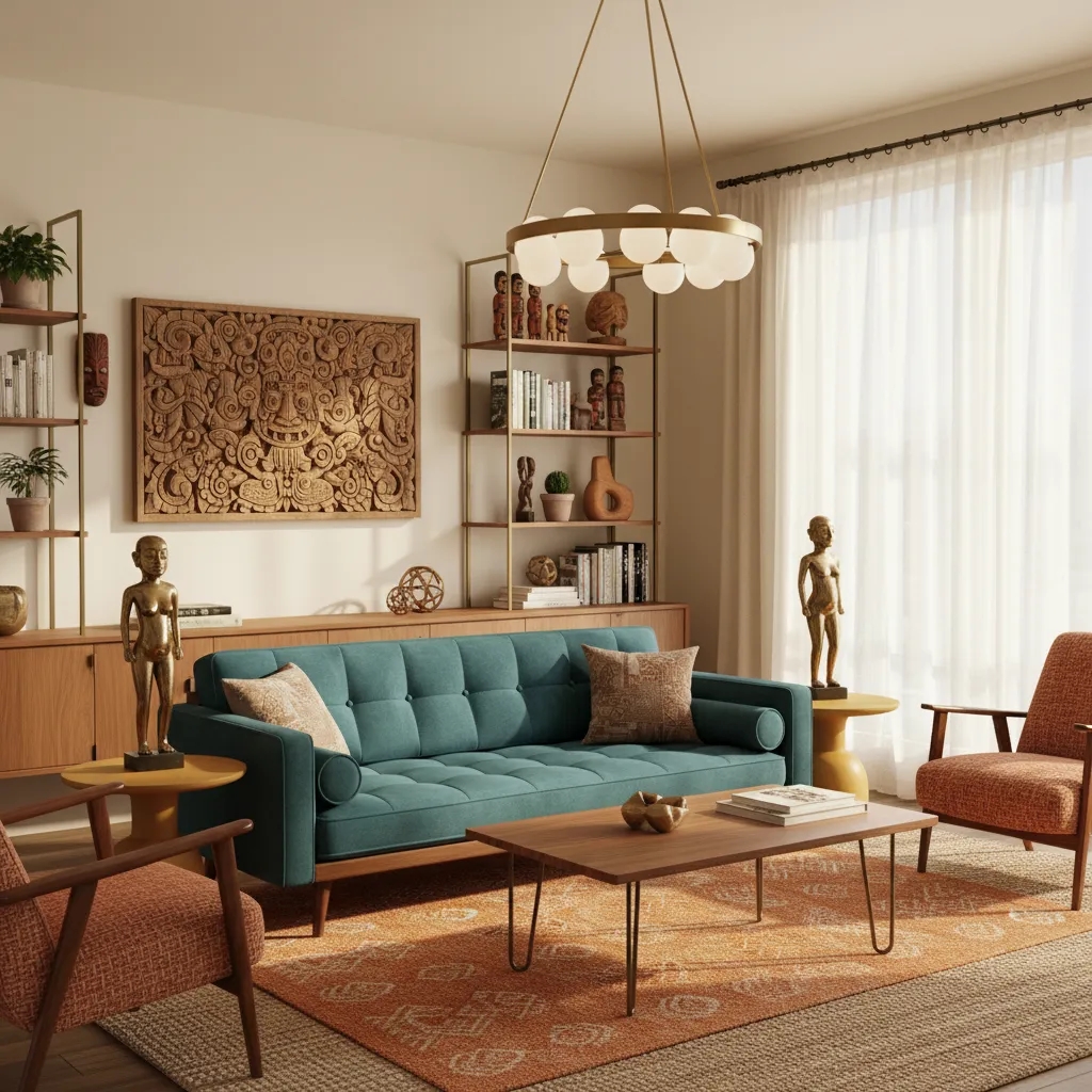 Mid-century design plays well with global influences. Incorporating handcrafted items, such as brass statues or intricate wooden carvings, can add a layer of history and travel to your room. You might find inspiration in Indian Living Room Decor Ideas, where vibrant colors and intricate craftsmanship can be subtly woven into a modern layout for a unique, collected look.