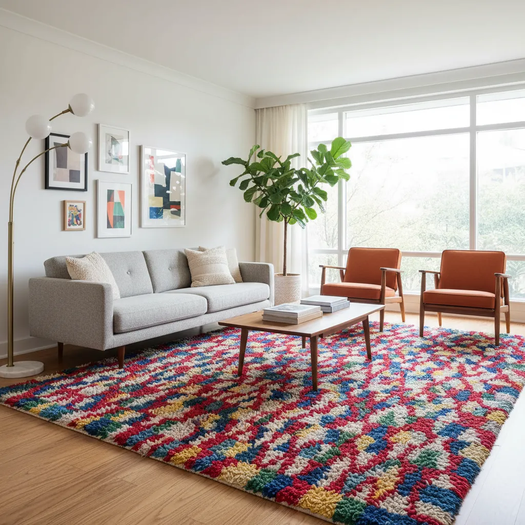 A fluffy, colorful Moroccan shag rug adds incredible texture and a bohemian twist to a structured room. The chaotic, colorful patterns of these rugs break up the clean lines of the furniture, adding a layer of playfulness. If you love this eclectic mix, exploring Modern Boho Living Room Ideas might give you further insight into blending these styles effortlessly.